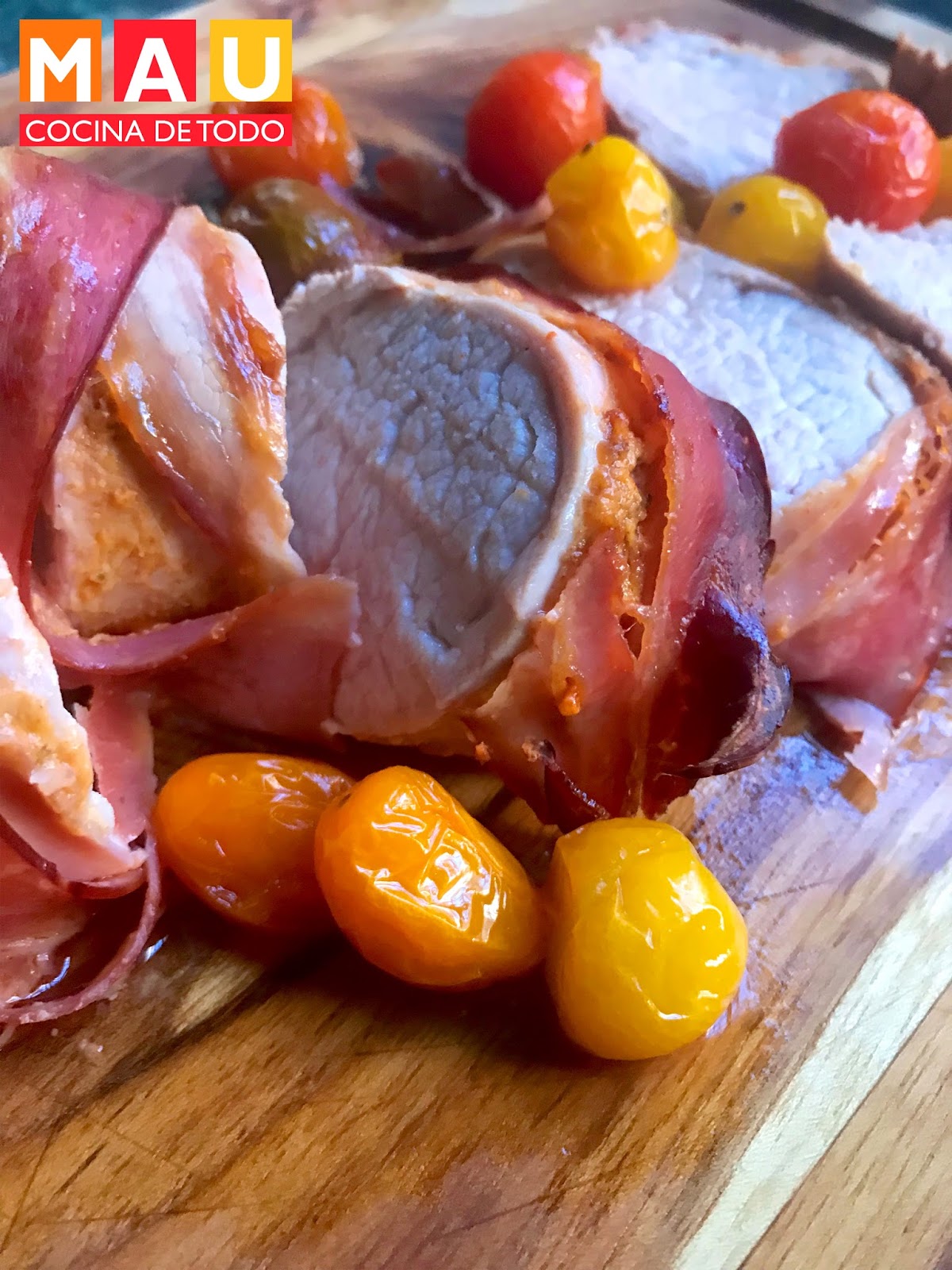 -Envuelve la caña de filete con tocino, colócala en una charola para horno con un chorrito de agua y hornea de 30 a 40 minutos. Yo coloqué unos tomates cherry en la charola. Es opcional o puedes agregar papa en cubos o rebanadas.