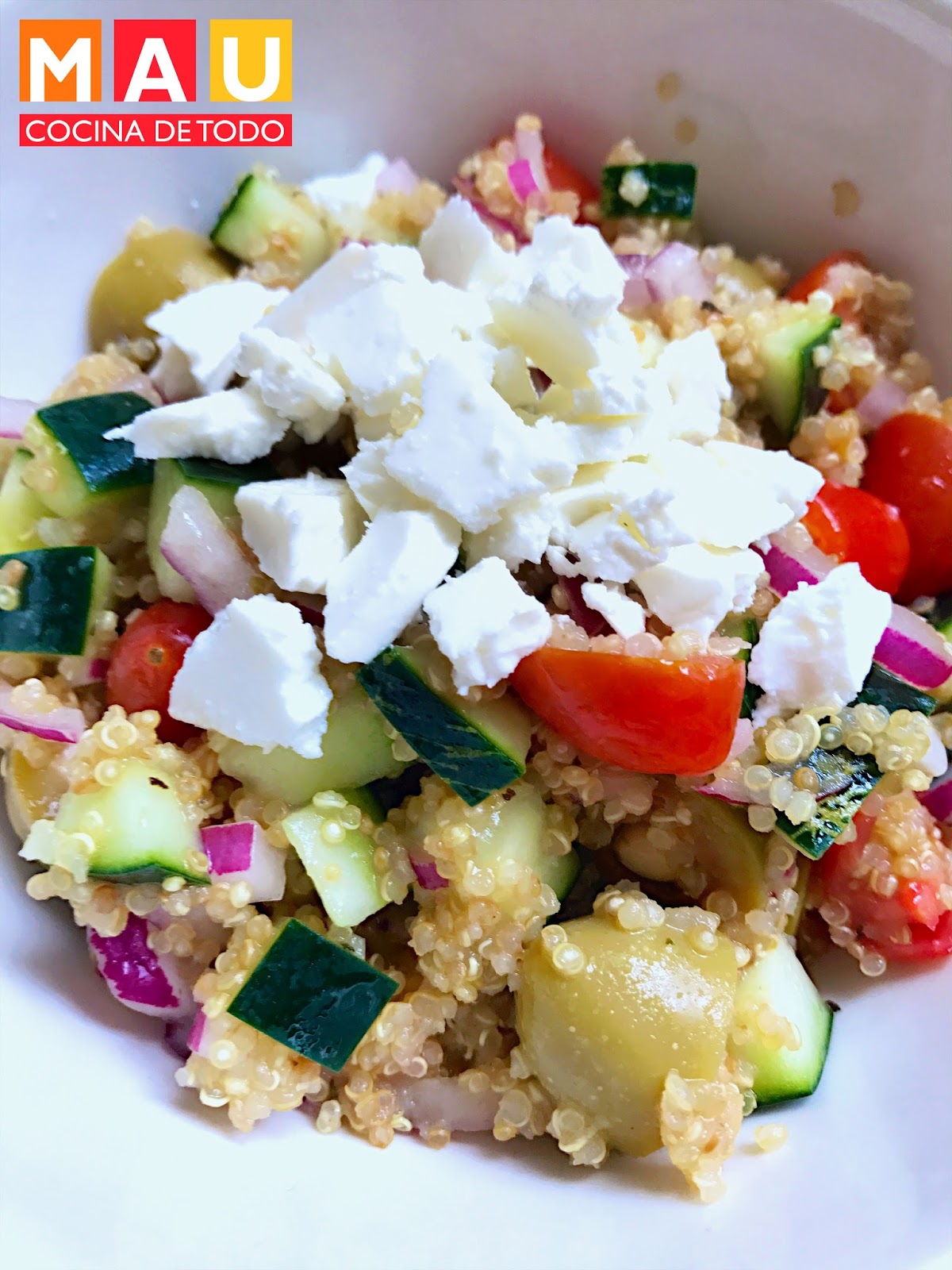 Lo que me gusta de la ensalada es que la base es de quinoa, una semilla con un gran aporte nutrimental alto en fibra y proteína vegetal.