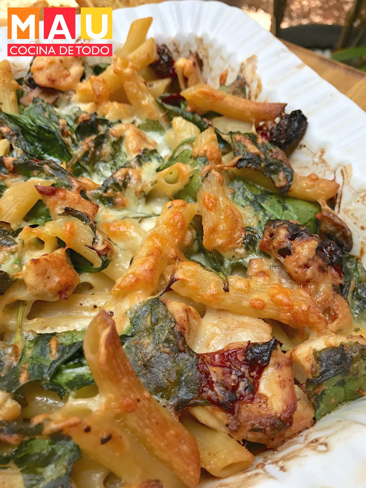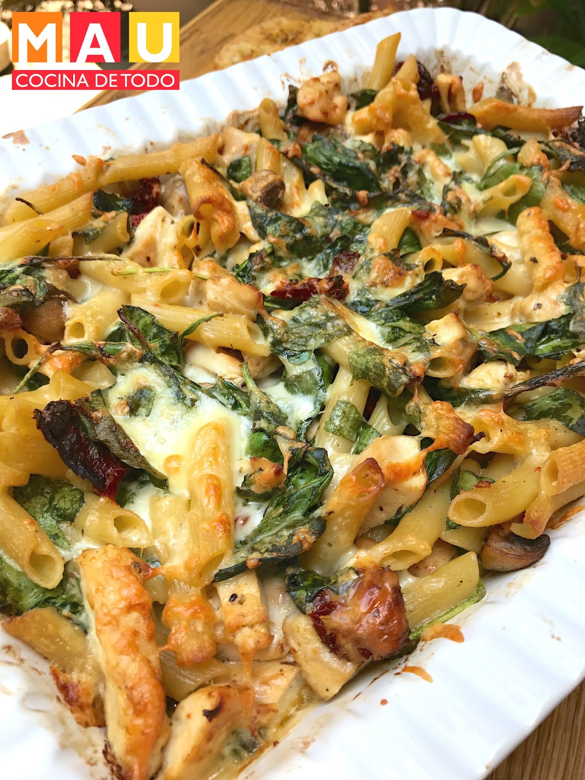 -En un tazón grande agrega la pasta, el pollo (partido en pedazos), los champiñones, tomates deshidratados, espinacas (frescas), la mitad del queso, la crema, el agua de la pasta y sal al gusto.