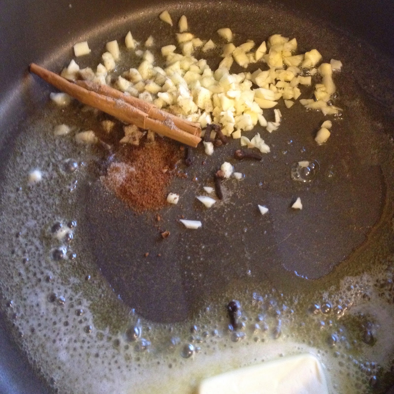 -A una olla o sarten grande agreguen la mantequilla, ajo, canela, jengibre, chile serrano, cardamomo y nuez moscada. Doren un poco hasta que puedan sentir el aroma de los ingredientes.