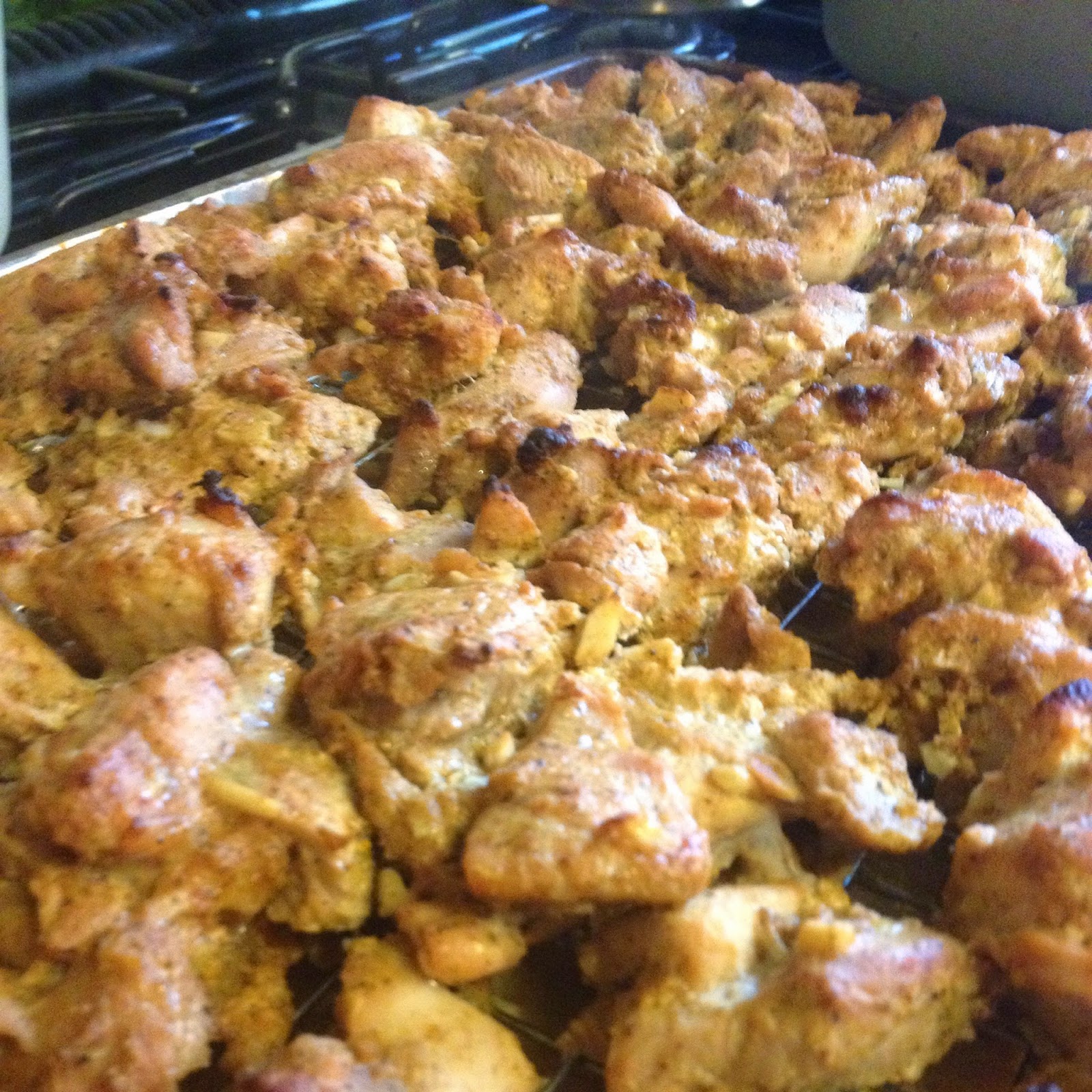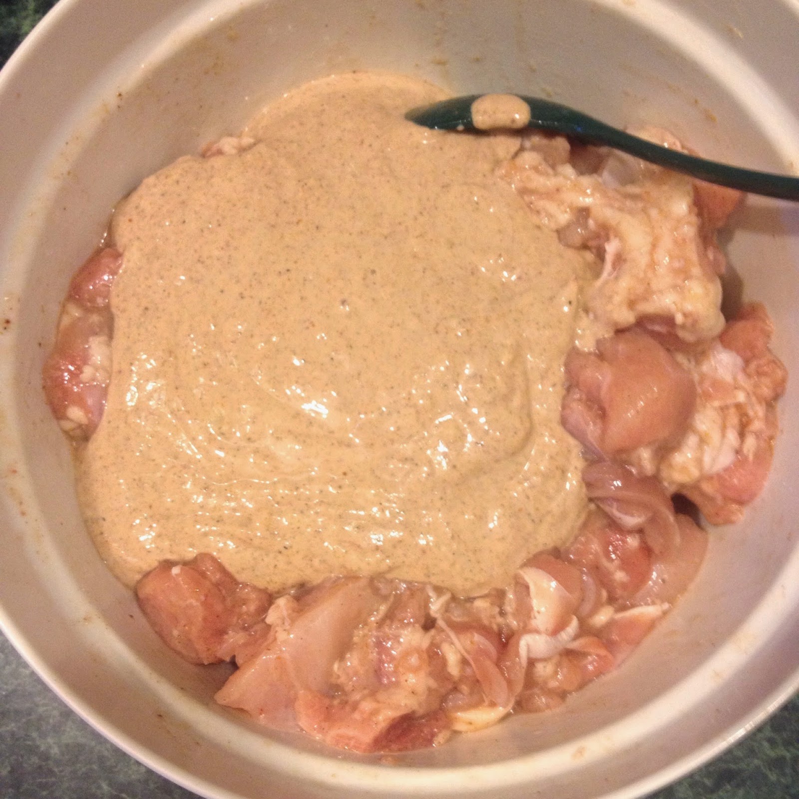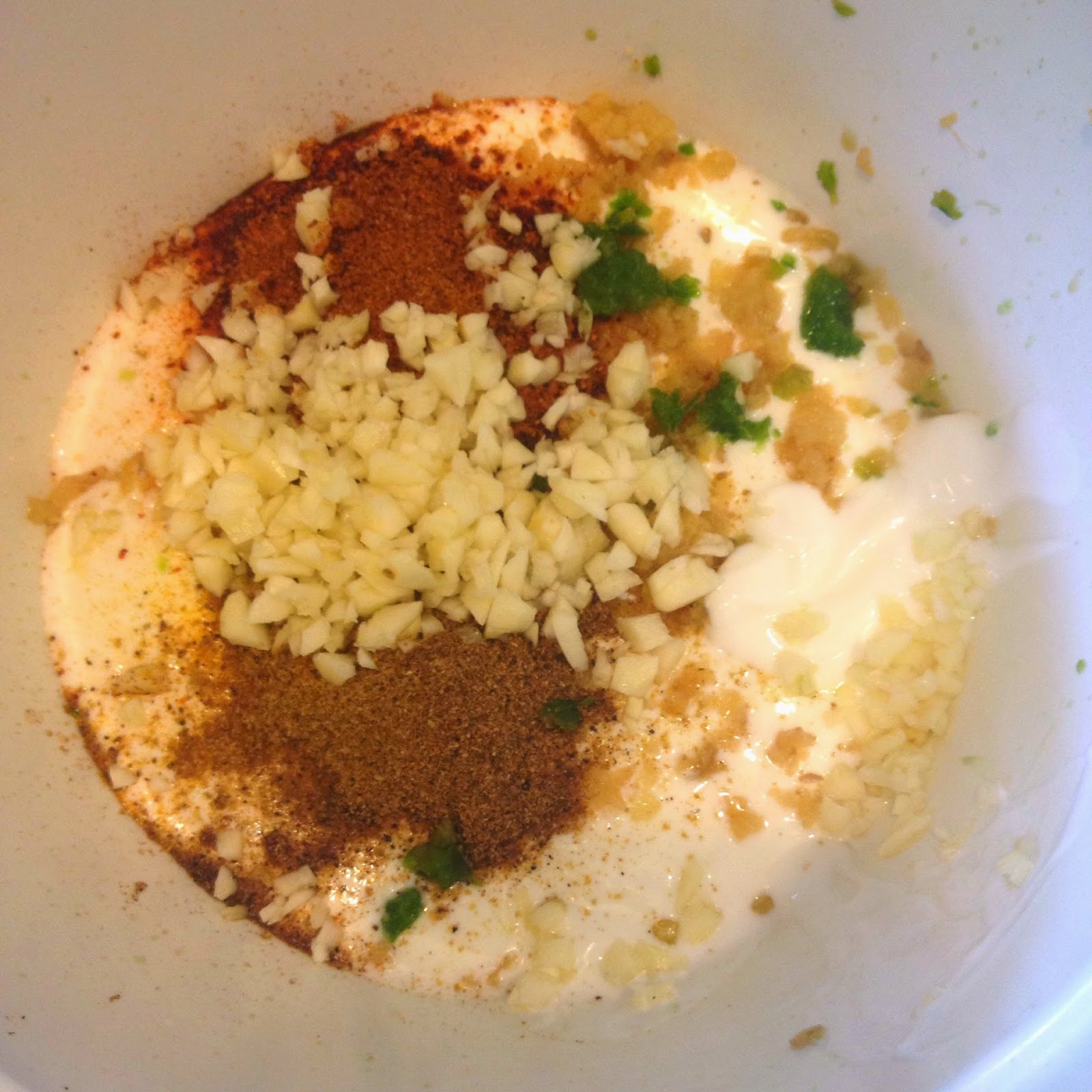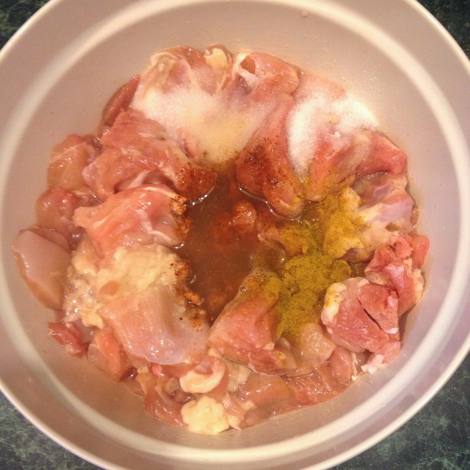 -Coloquen todo el pollo en un tazón y agreguen el jugo de limón, chile, curry y sal. Reserven mientras preparan el segundo marinado.