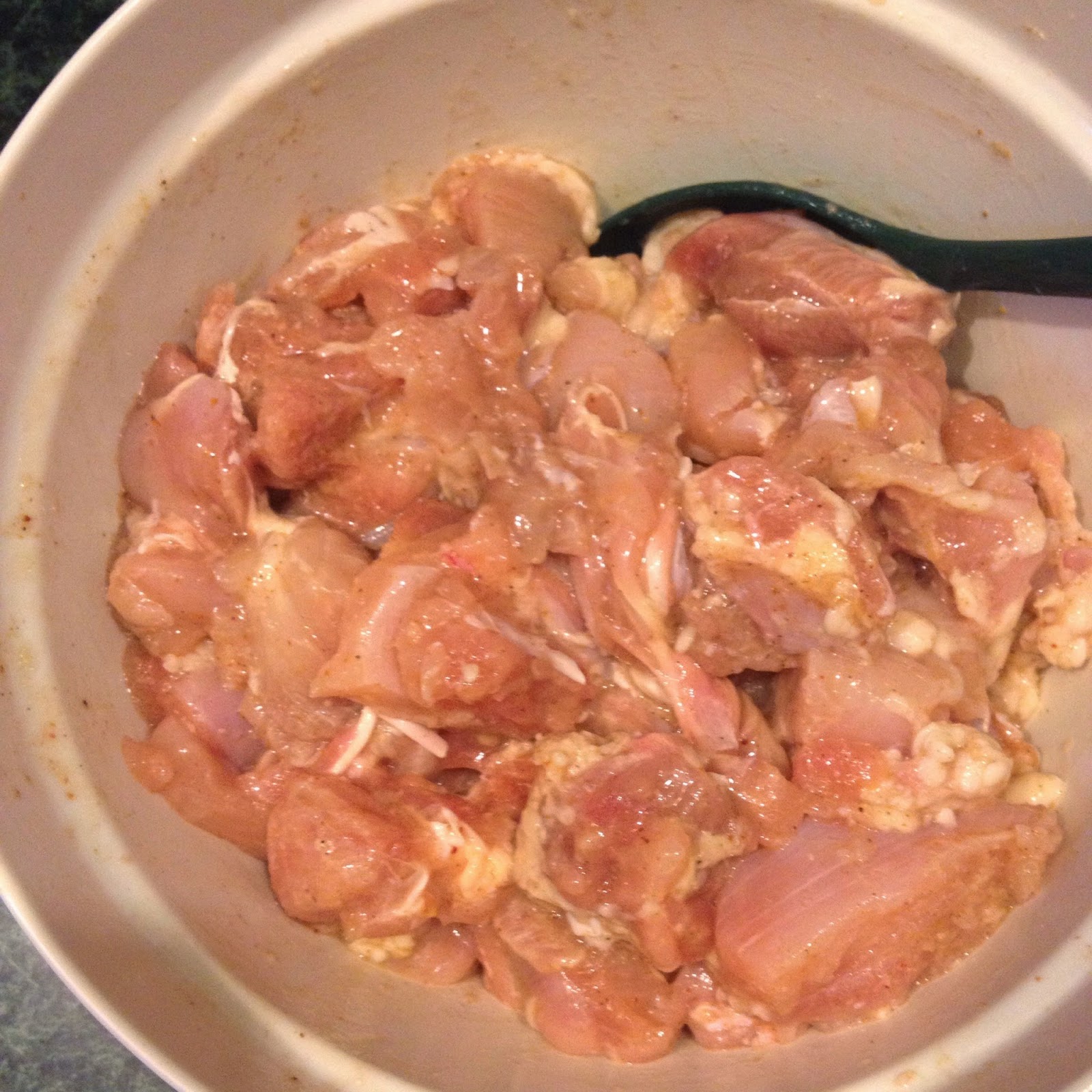 -Corten el pollo en pedazos de como 3cm o un poco mas grandes.