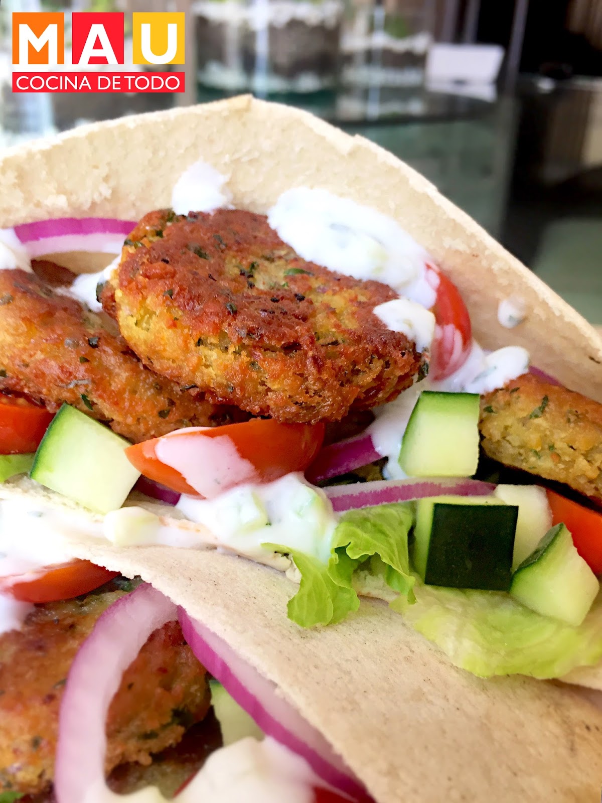 -Prepara los sandwiches cortando el pan pita por la mitad (medios circlos) rellenando con lechuga, falafel, tomate, pepino, cebolla y aderezo de yogurt.