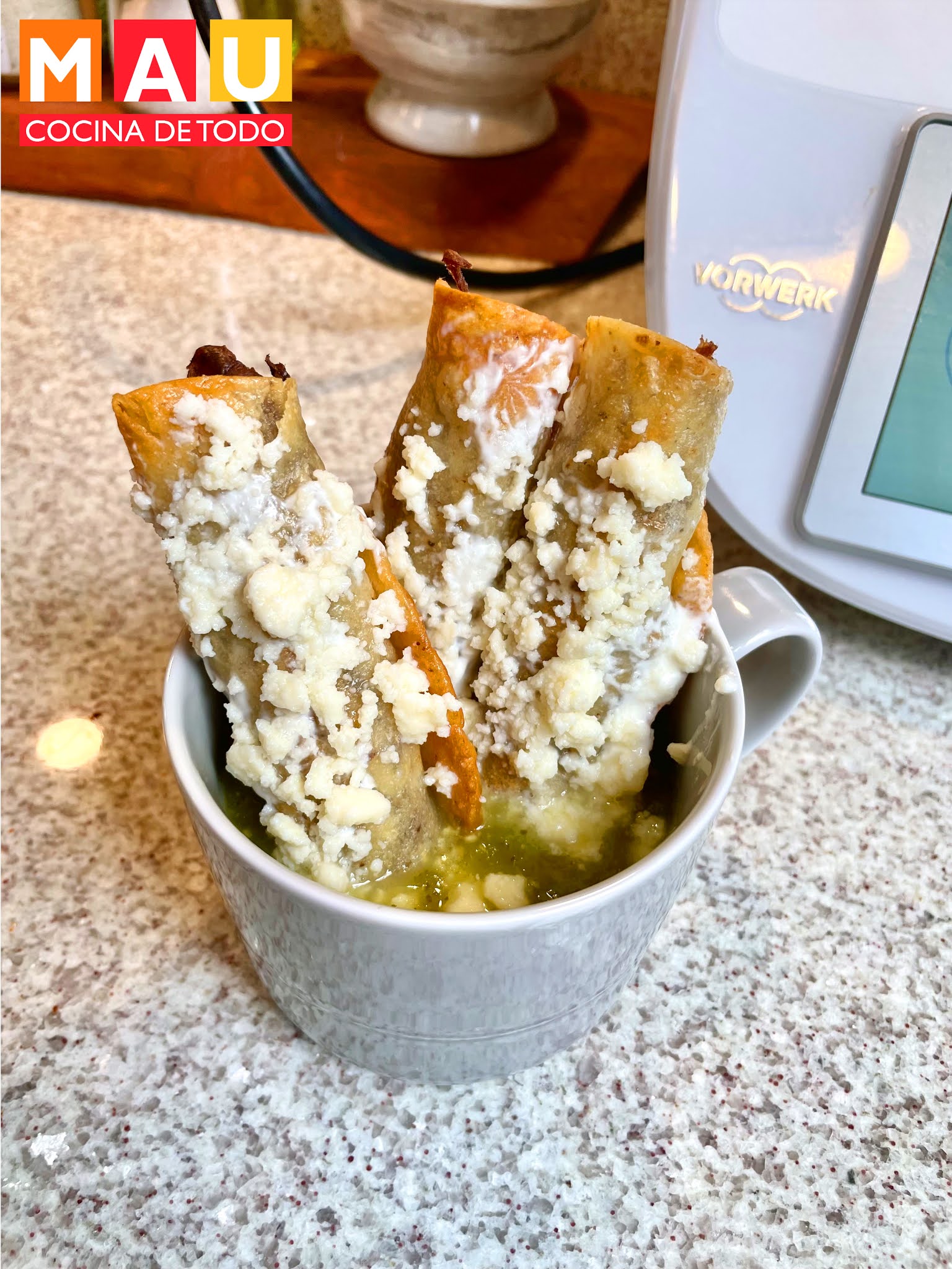 Me encantan las flautas ahogadas. En Monterrey acostumbramos a comerlas con salsa de aguacate pero esta versión se me hace super rica. Tengo otra receta aquí en mi blog pero el caldillo es de tomate rojo, este es verde y quedan deliciosas. Es una receta para 2 o 3 personas, duplícala si van a comer mas personas.