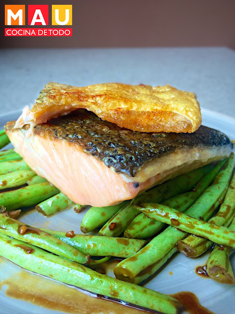 -Sirve los ejotes y la salsa en un plato y coloca el salmon arriba de los ejotes con la piel para arriba.