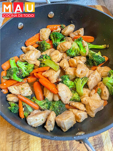 -Reserva el brócoli con la zanahoria y ahora agrega el pollo.