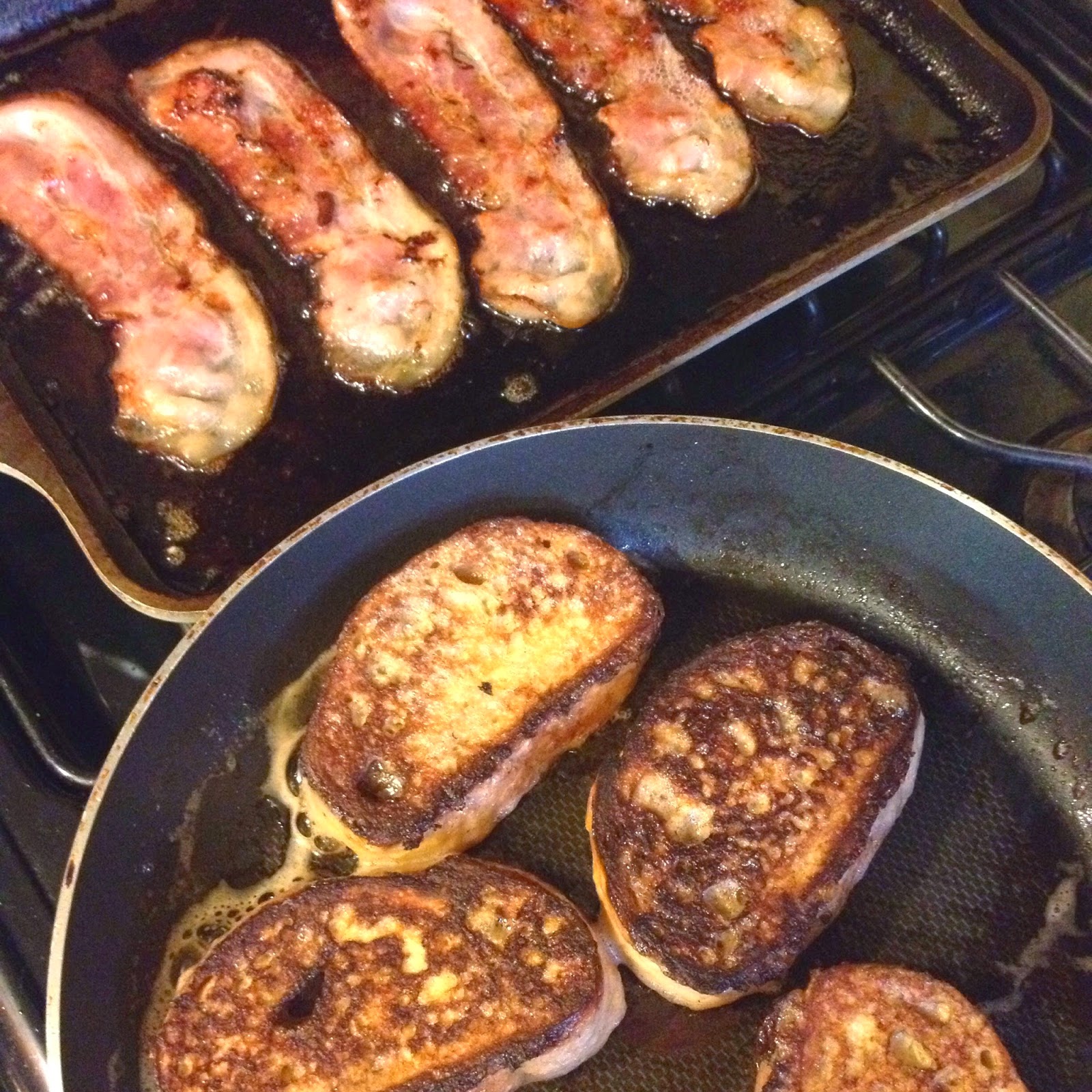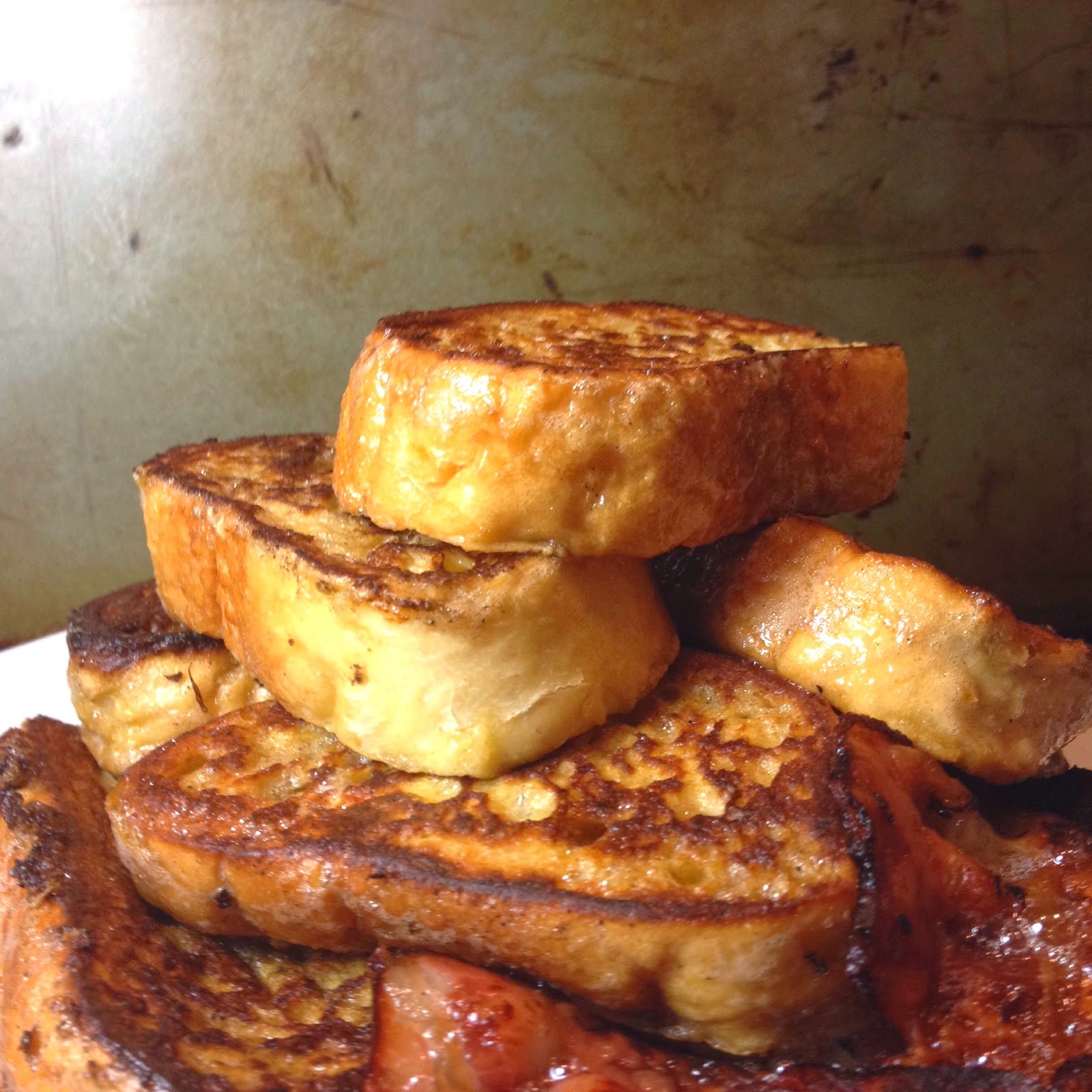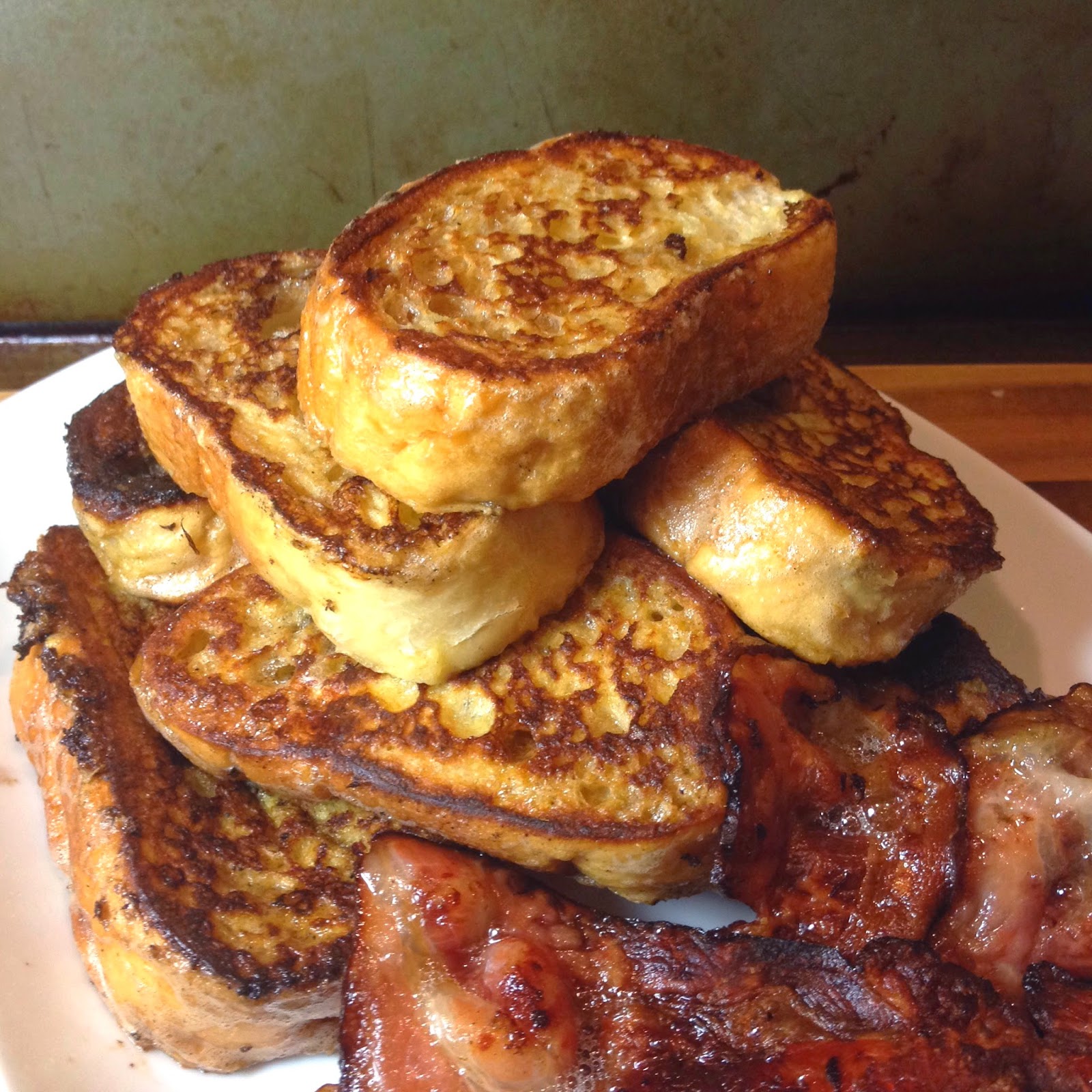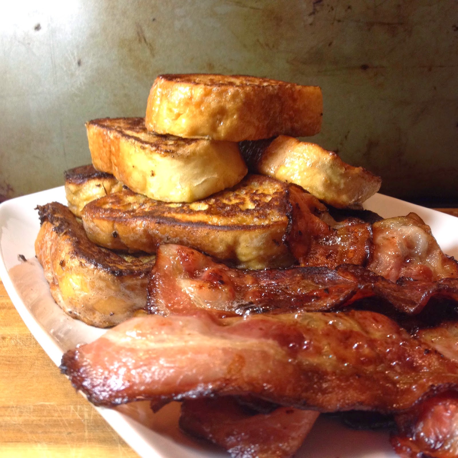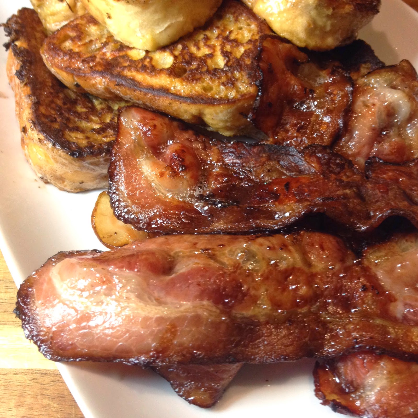 El pretexto para usar el tocino fue hacer torrejas o french toast. Me encantan las torrejas que cosa tan mas deliciosa. Ya había hecho una receta de torrejas con crema batida y plátano pero esta es mas simple. Servidas con un poco de miel y tocino. ¡Uff!