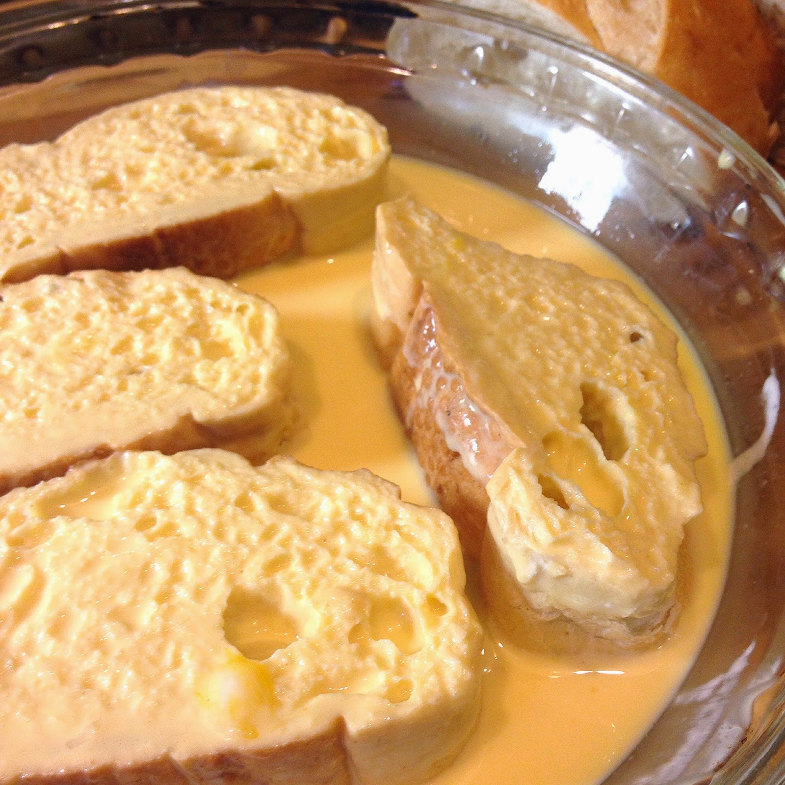 -Agreguen las rebanadas de pan a la mezcla de huevo y volteen por ambos lados. Escúrranlas un poco y pasen al sartén a dorar. Tardan como 2 minutos por lado.