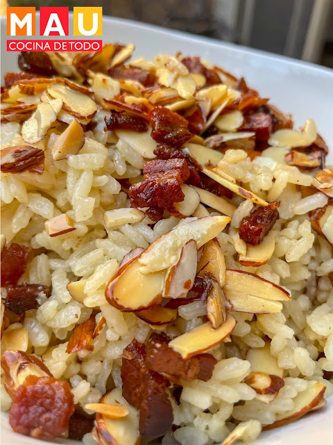 -Pasa el arroz a un tazón, agrega el tocino y las almendras y esponja con una cuchara o tenedor. Mezcla suavemente para que no se apelmase.