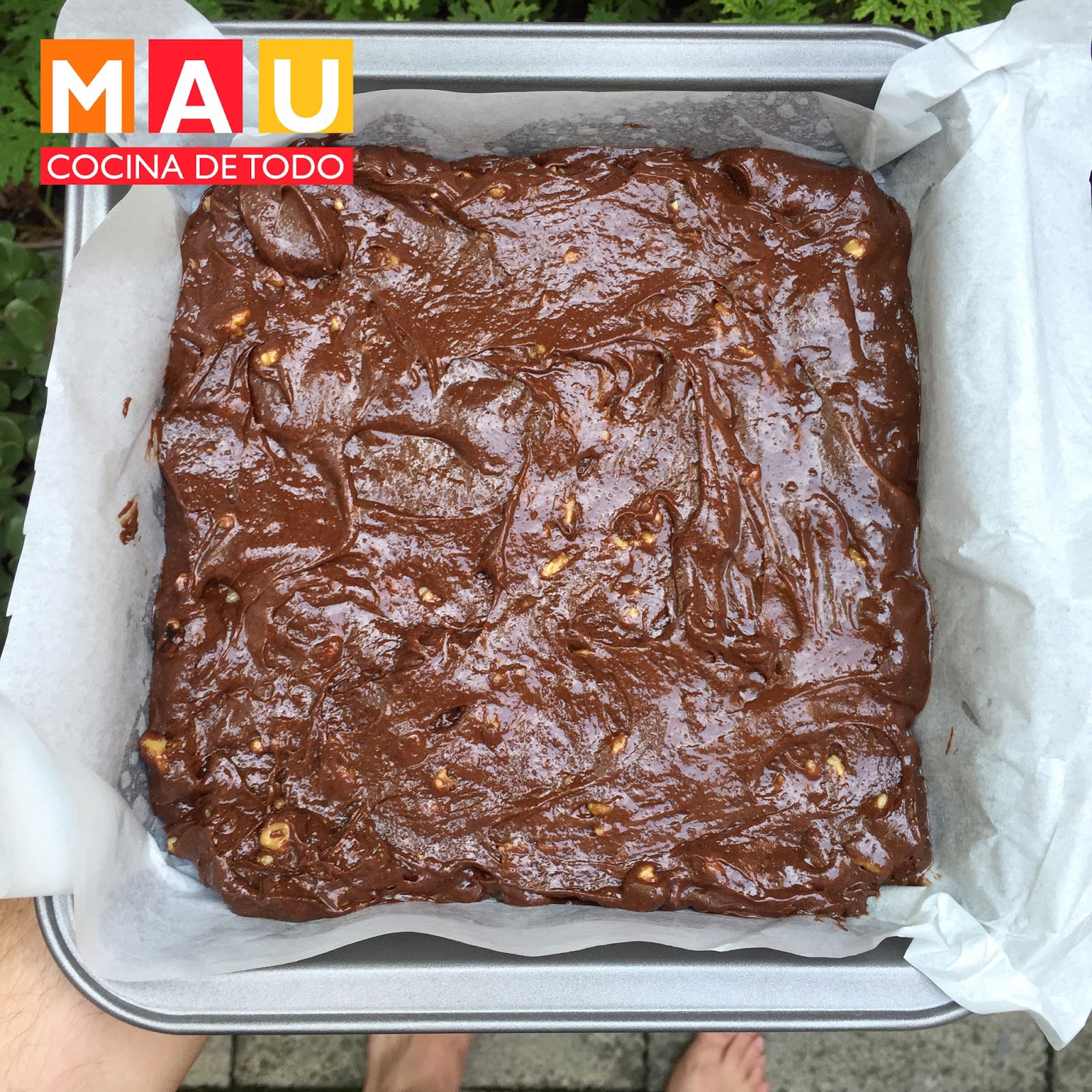 -En un molde cuadrado de 20x20cm (8x8") engrasado y usando papel para hornear vacía la mezcla.