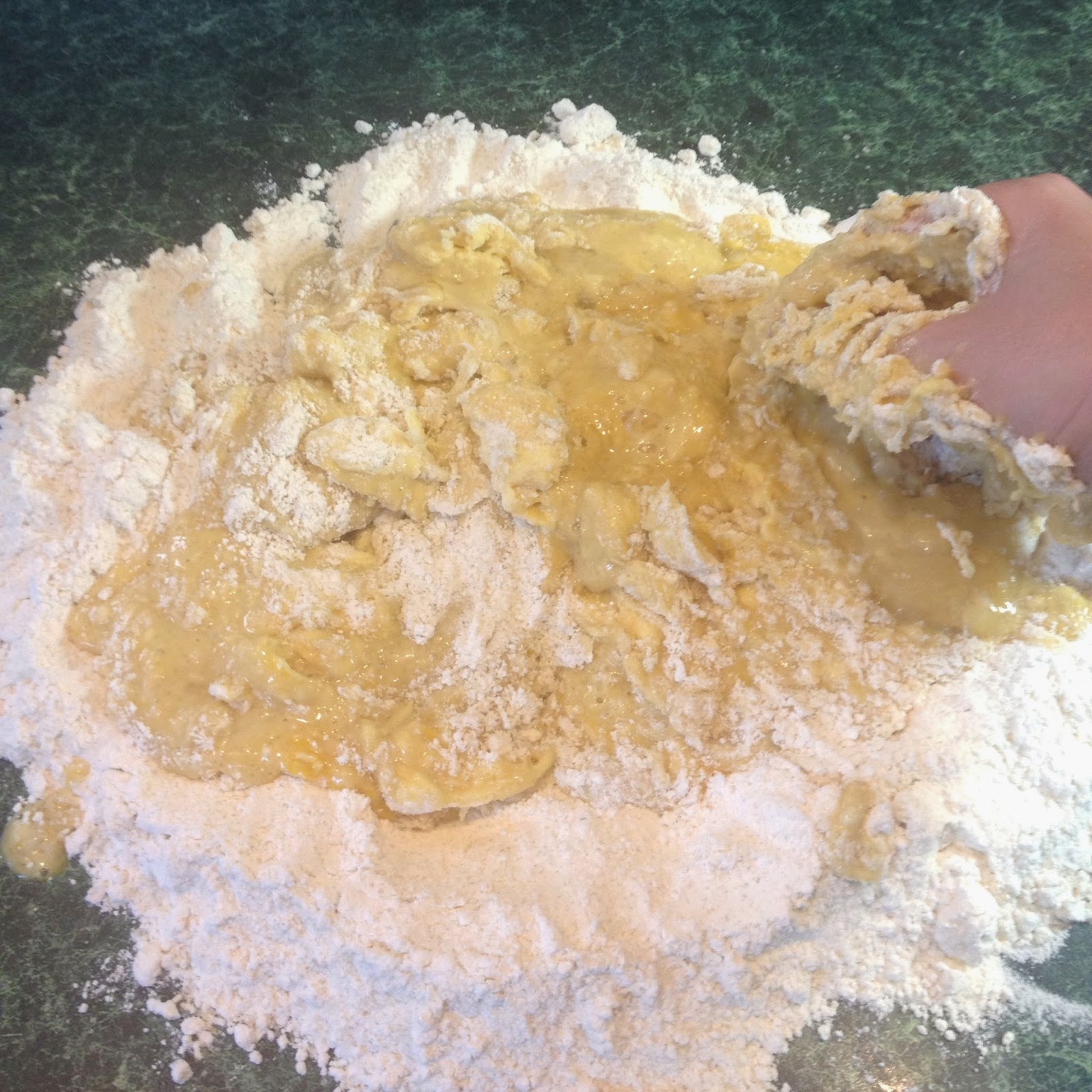 -En una superficie bien limpia coloquen la mezcla de harina y formen un cuenco al centro.