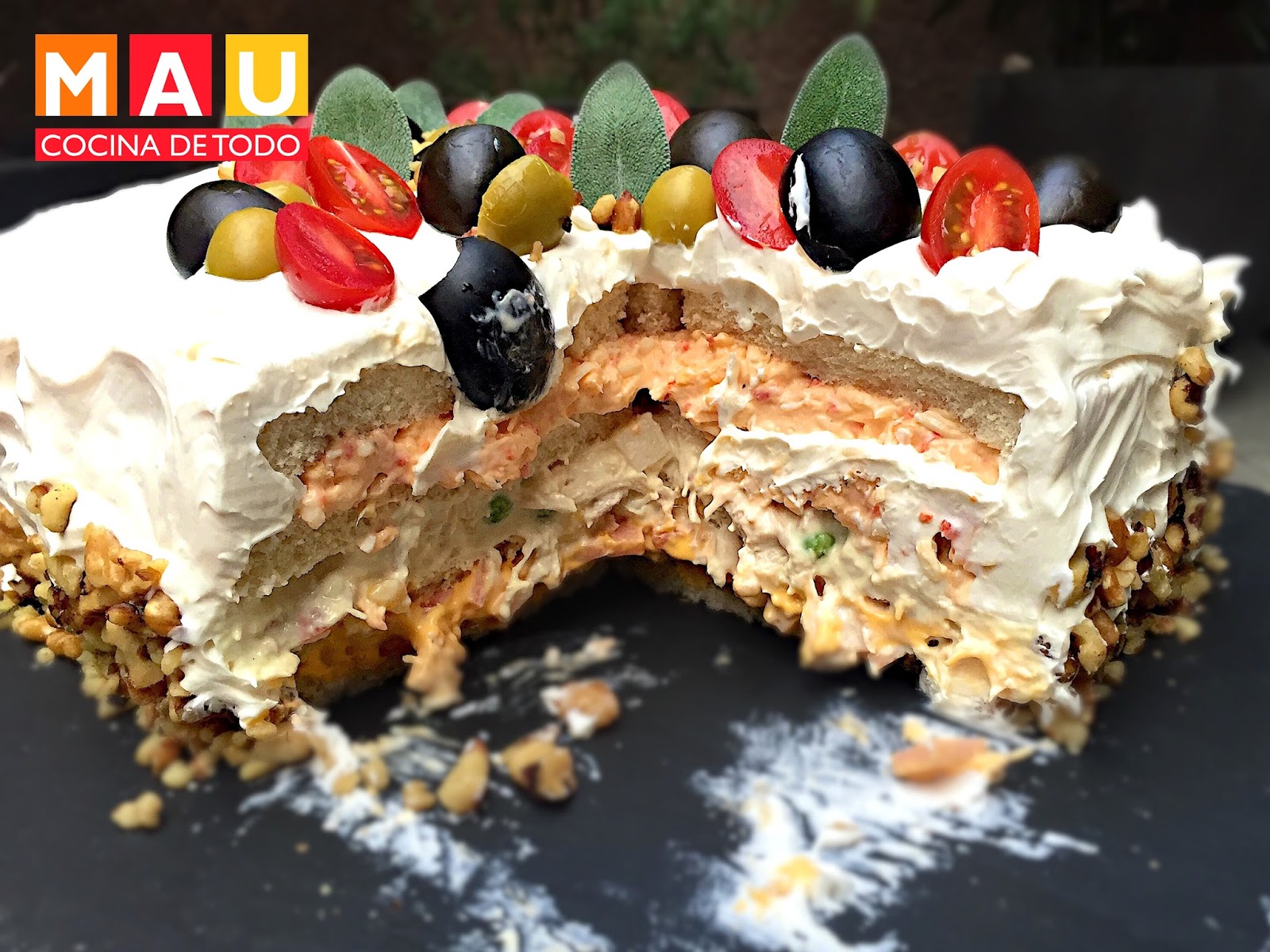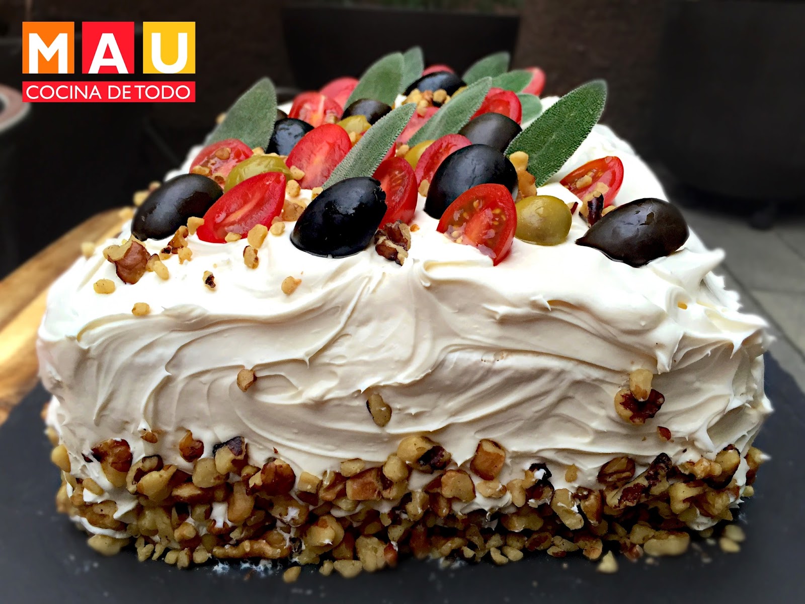 -Ahora es momento de decorar. Yo agregué nuez picada en las orillas de abajo. Partí los tomates y aceitunas por la mitad. Usé hojas de salvia para darle más color.