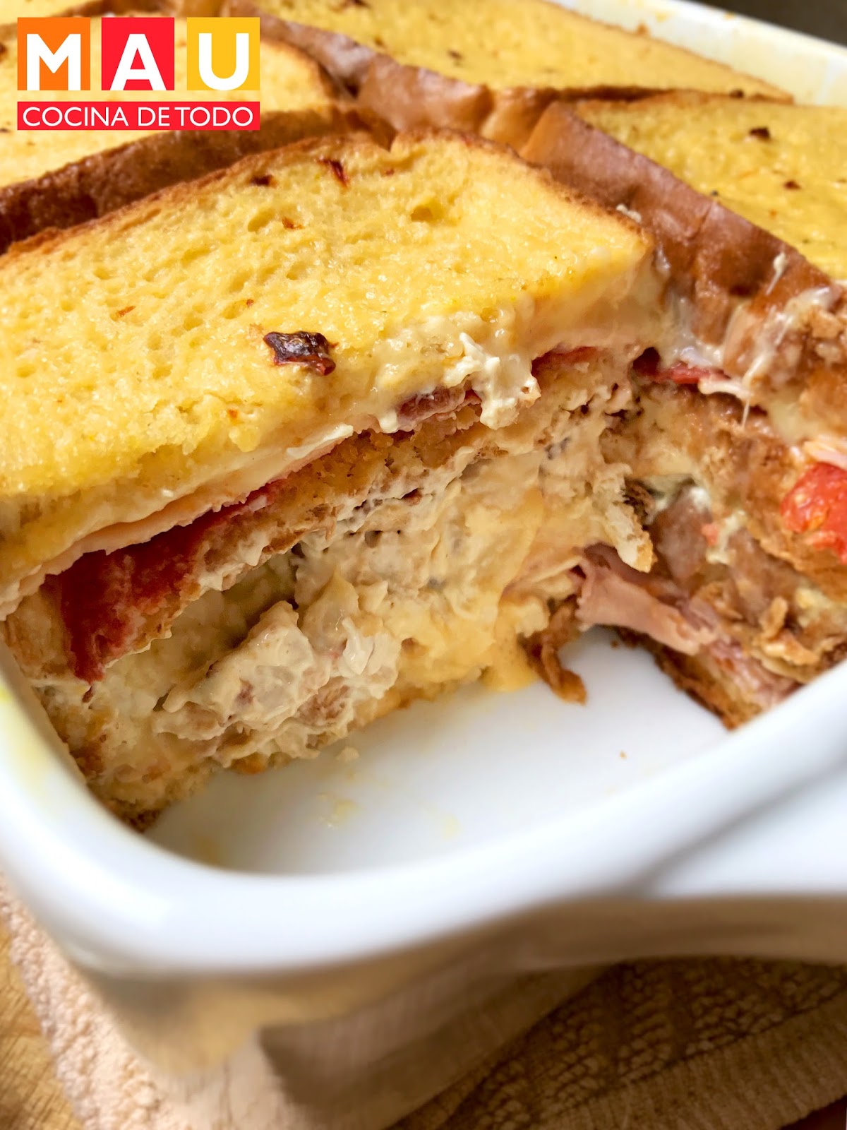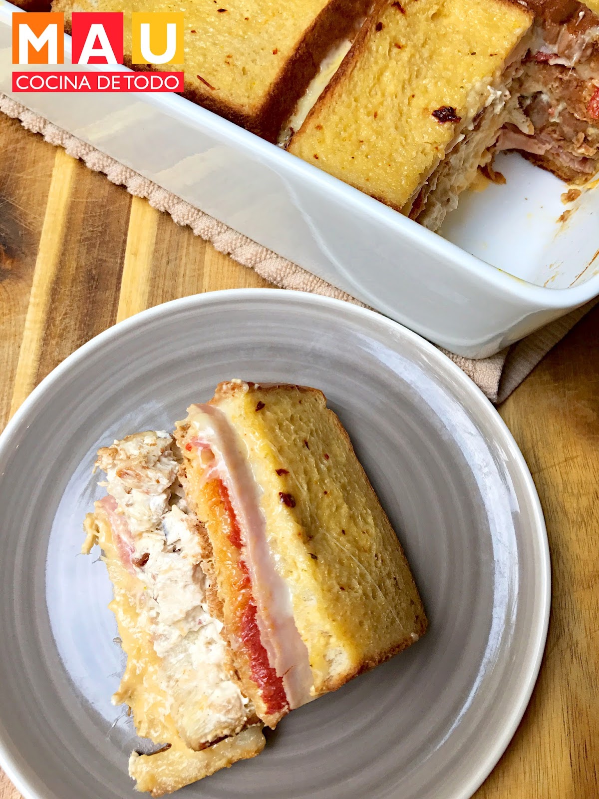 Básicamente es preparar un sandwich gigante en un molde para horno, bañarlo con una salsa cremosa y hornearlo para que todo quede bien calientito. Tipo una lasaña para flojos. Lo que me encantó es que se puede tener todo listo con tiempo y hornear media hora antes de cenar.