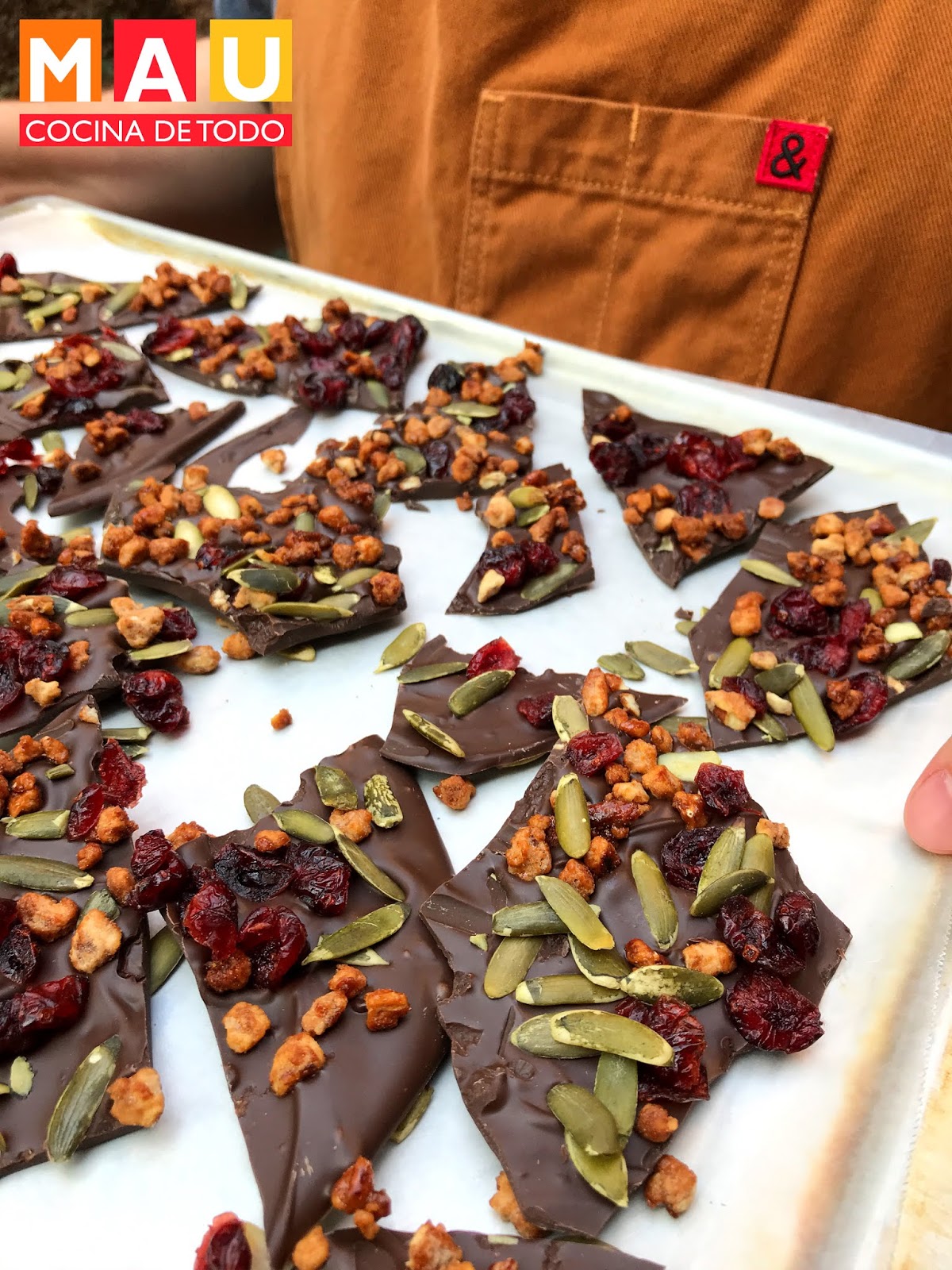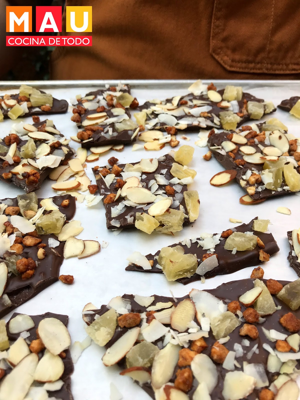 -Coloca las nueces, semillas y frutas sobre el chocolate.